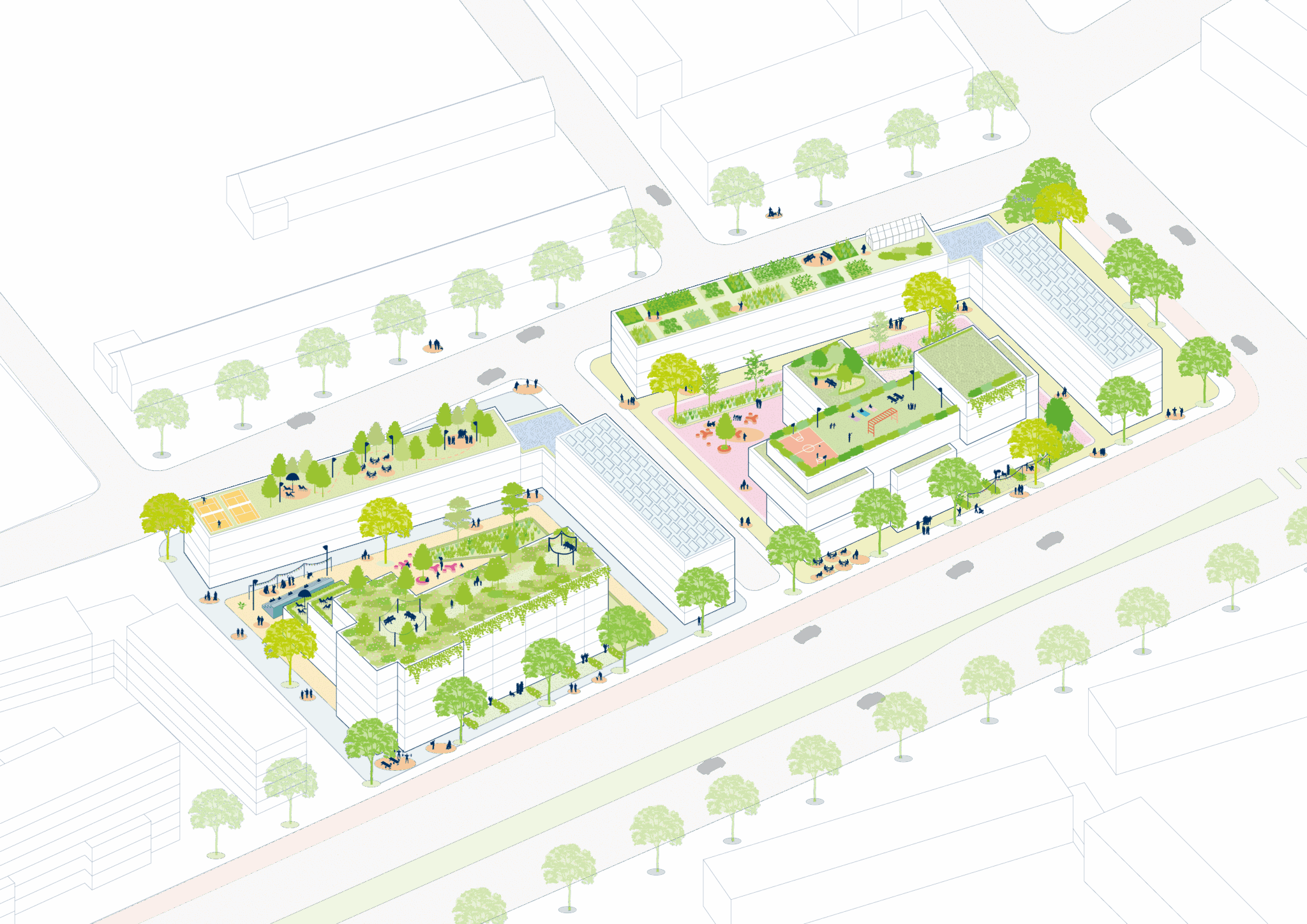 De constructie van de huidige drie sterflats uit de jaren 50 en 60 biedt de mogelijkheid om 3 extra bouwlagen toe te voegen aan het huidige ensemble. In gesprek met gemeente Eindhoven, bewoners en omwonenden kwamen wij tot een moderne optopping en aanbouw, welke de karakteristieke stervorm benadrukt, en een nieuw biodivers landschap.